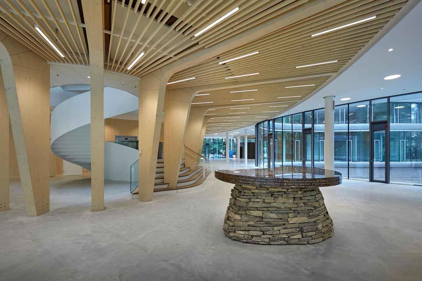 Die drei transparenten Türme der Bank orientieren sich an den Flugbahnen von Fledermäusen und fügen sich in die Landschaft ein, ohne die Baumgrenze zu überschreiten. Großzügige Glasfassaden schaffen helle Arbeitsplätze und ermöglichen 360-Grad-Blicke in die Natur. Innen sorgen pilzförmige Holzstützen für eine fast kathedralenartige Atmosphäre.